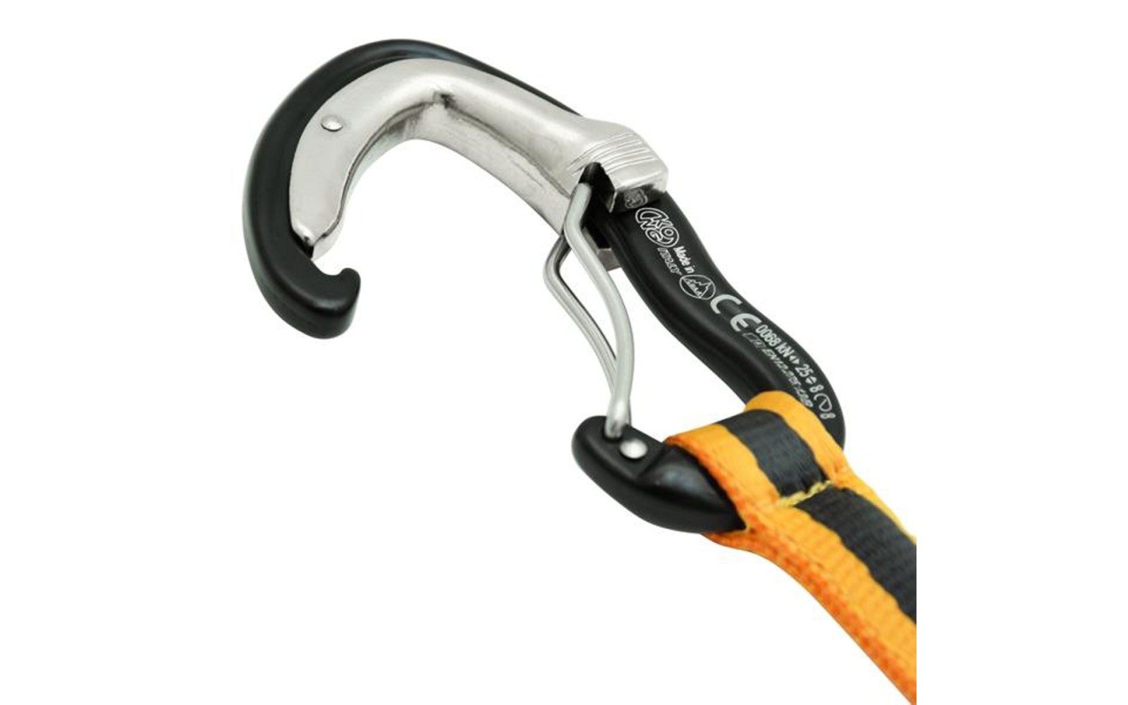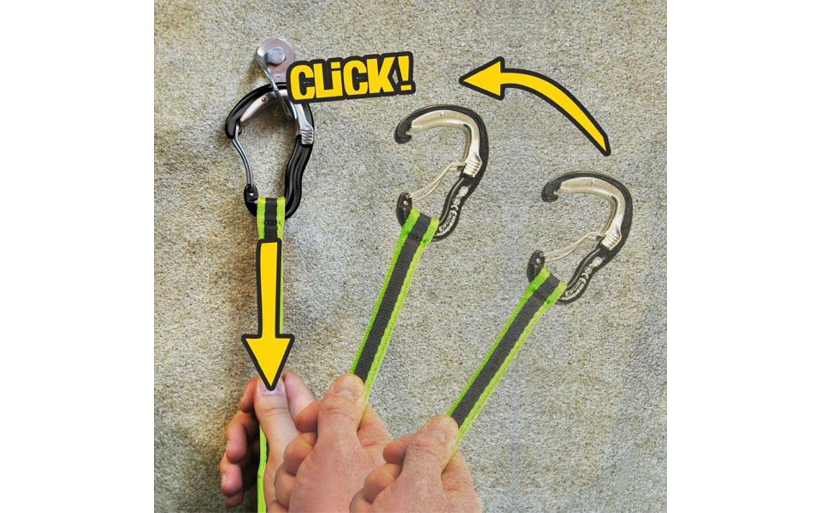 - Un mosquetón con un ingenioso sistema mediante un mecanismo que mantiene el gatillo abierto hasta que el mosquetón se apoya sobre el seguro. En ese momento el mecanismo libera el gatillo del mosquetón y se cierra.