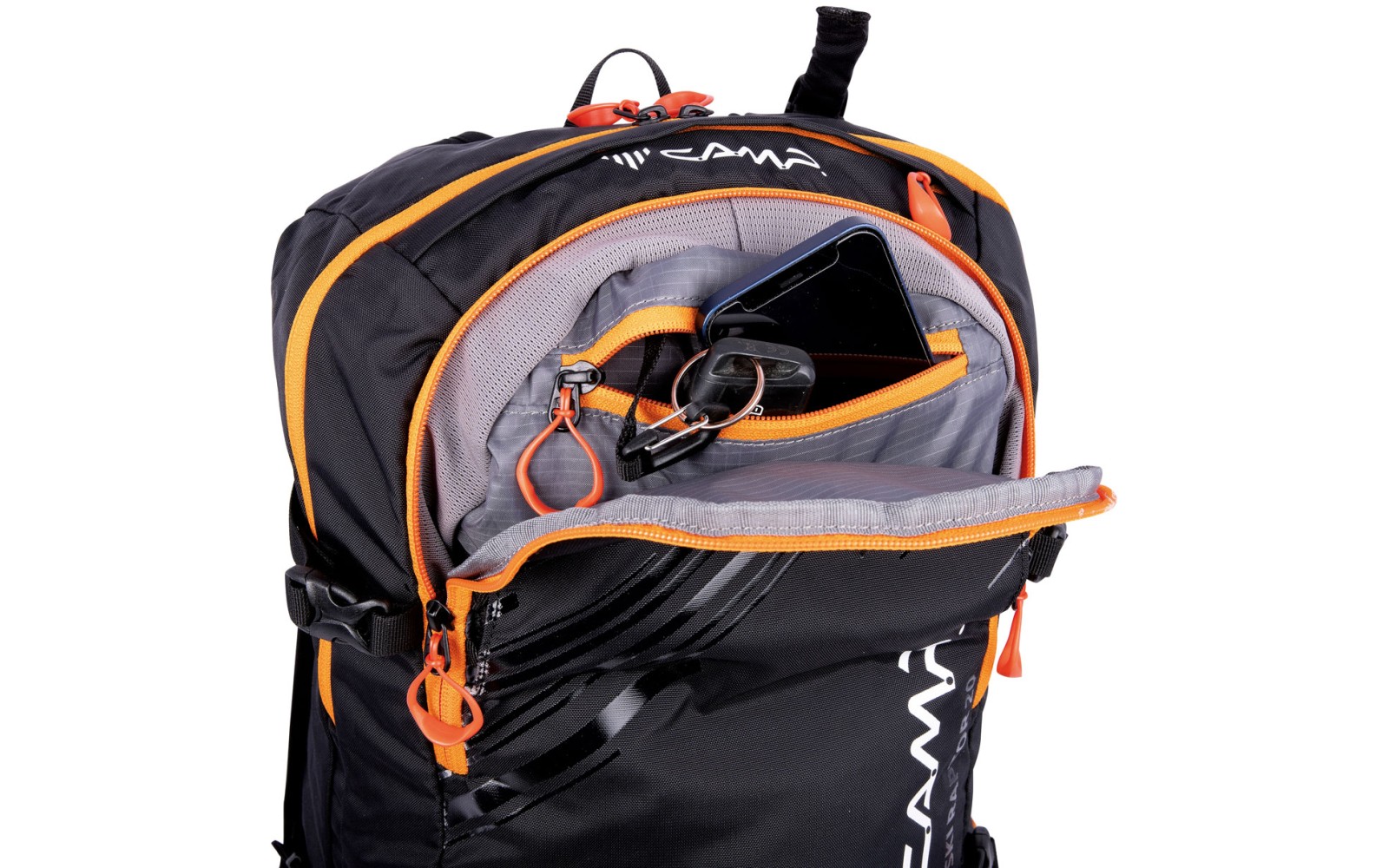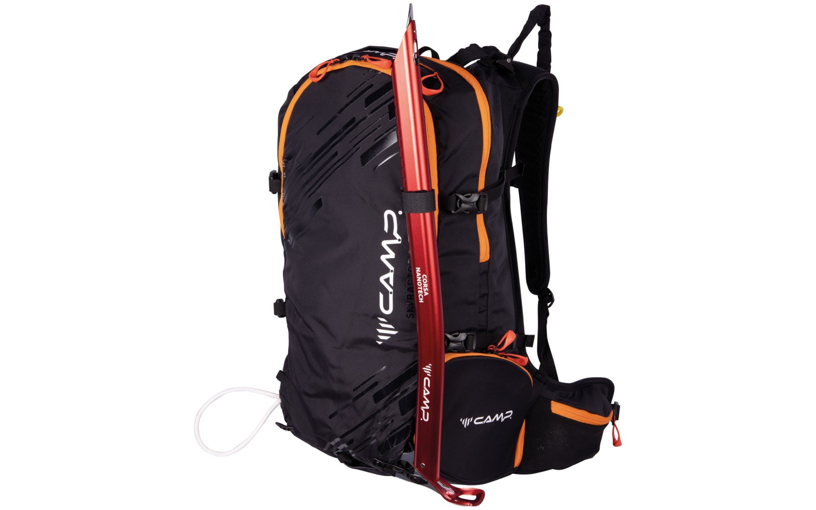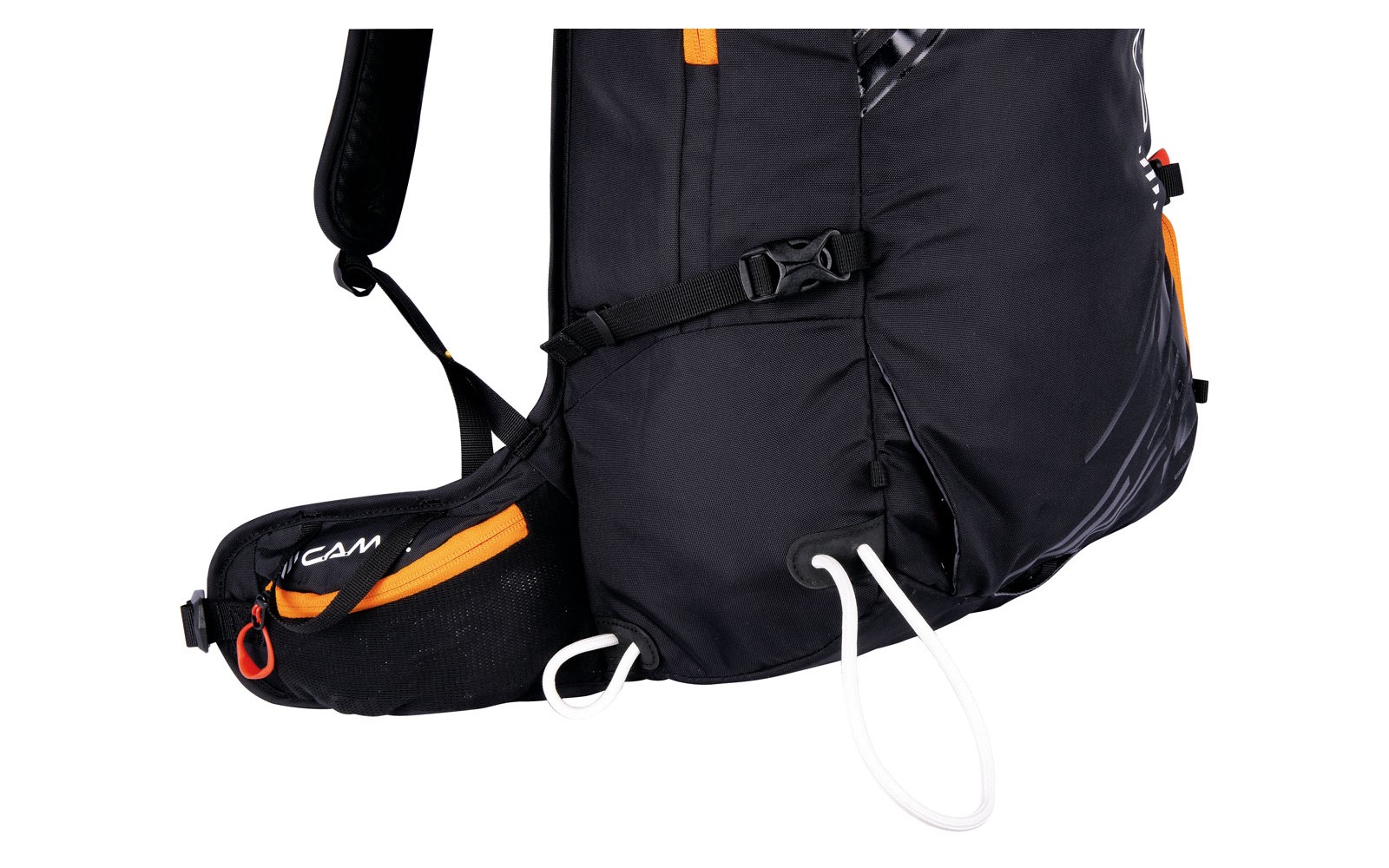 Incluye sistemas ocultables y desmontables para transportar bastones, piolets y casco, además de un compartimento lateral específico para crampones. Como novedad, incorpora un bolsillo frontal de acceso rápido para pala y sonda, ideal para situaciones de seguridad en montaña.