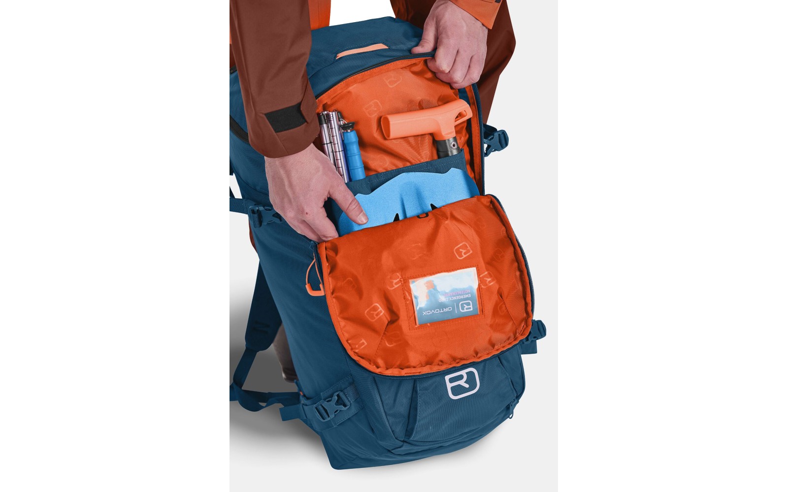 - Amplio compartimento frontal para el equipo de rescate en avalancha, con abertura en U y cierre de cremallera con tirador.