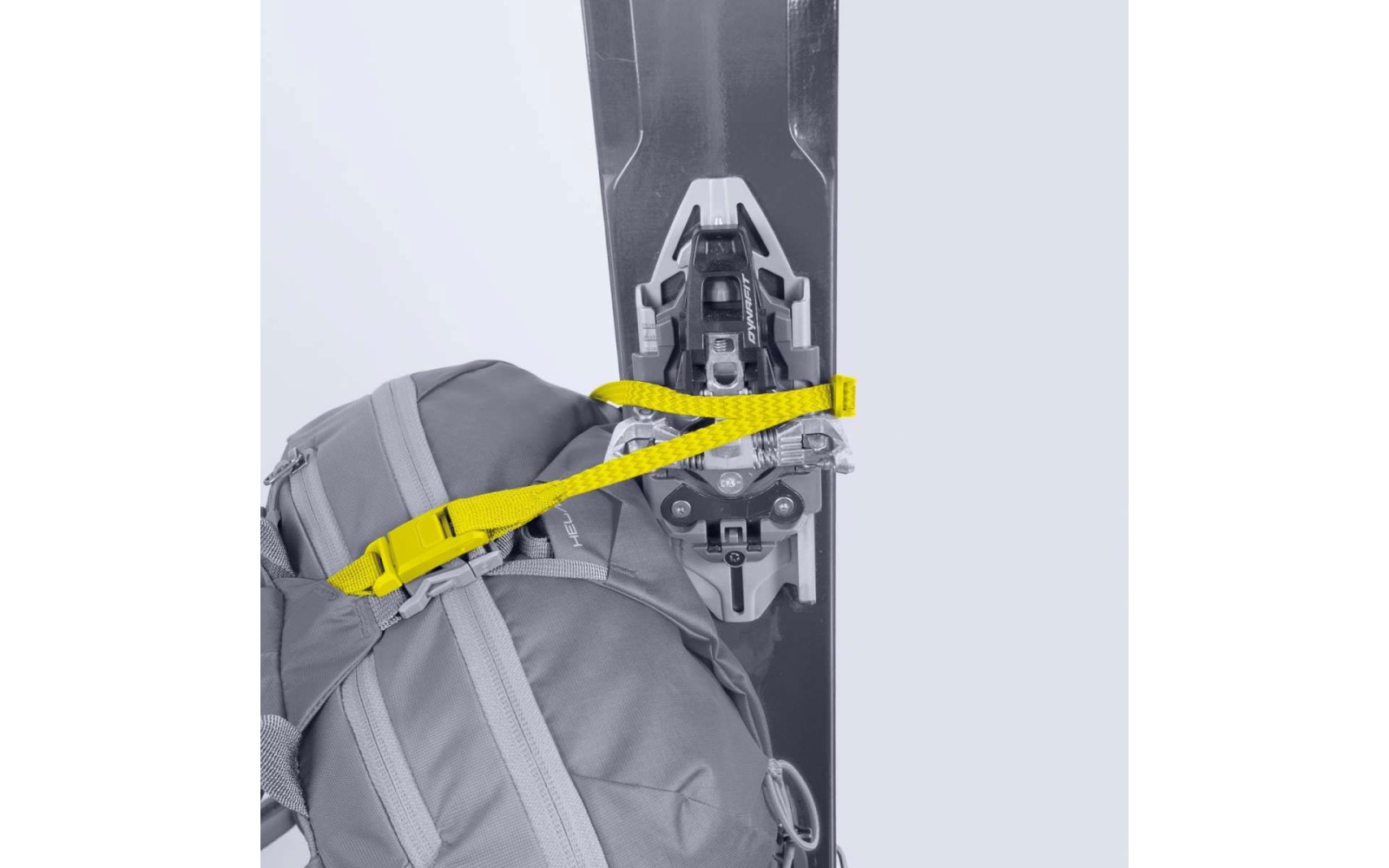 - Entre otras características, se incluyen el enganche diagonal para esquís con hebillas magnéticas que facilitan un manejo sencillo y rápido (incluso con los guantes puestos) y opciones de enganche doble (fijación en movimiento gracias a la hebilla frontal o el enganche trasero), un compartimento base separado con cremallera y reforzado para las pieles, los crampones o la ropa húmeda, el piolet y el gancho para bastones.