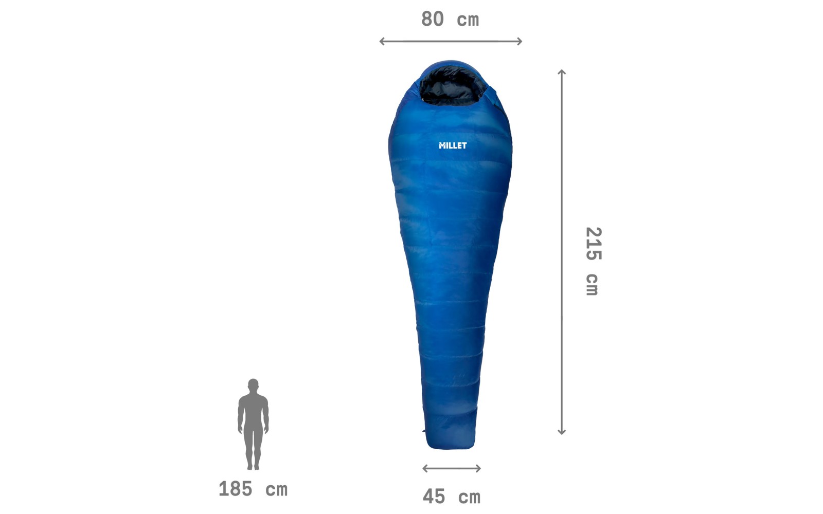 - Medidas exteriores (cm): longitud (215), ancho en hombros (80), ancho en pies (50).